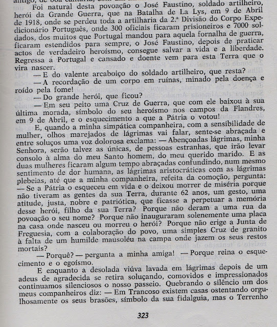 Onde a autora fala e muito bem de um dos antepassados da nossa terra, no livro fala-se do sr. José Faustino, mas podia ser o meu avô, José Henriques Dias, também ele serviu nesta guerra e depois de voltar, foi abandonado , não só pelos "responsáveis" que para lá o enviaram, mas também pela nação que eles foram defender.